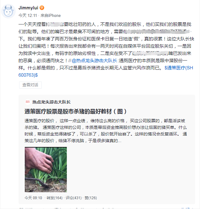 17日中午11:57,吕建明转发一位名叫@热点龙头游击大队长的网友发布的题为“通策医疗股票是股市杀猪的最好教材”的文章,并说“我来替你转发,看到的人多一点”。这篇被吕转发的文章写道:通策医疗这种老庄股杀猪股,存在于股市没有什么意义,唯一的意义是作为一个杀猪样板。