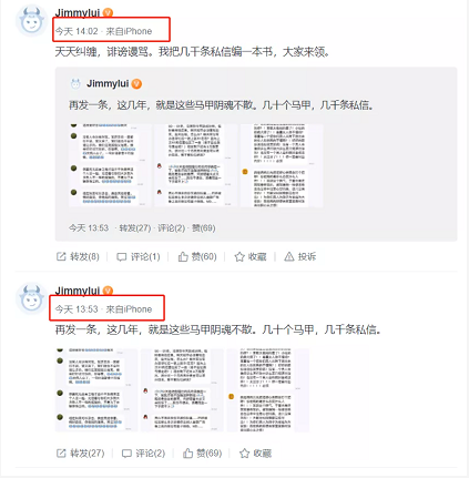 不过,随后在13:53、14:02,他又发布了几张谩骂他的私信截图,表示自己这几年,被几十个马甲,几千条私信,“天天纠缠,诽谤谩骂”。