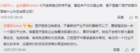 面对这一大跌,10月15日晚间,有投资者深夜在通策医疗董事长吕建明微博下评论:“业绩还没有发布,今天就跌停了,哪里出了问题啊,投资者真的需要你们给一个说法”。没想到的是,吕建明同样在深夜回复称:“我们这么好的成绩,泄露了涨停才对!”