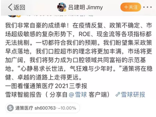 12:20,吕建明再发文称:现在种植牙还是极少数极少数中国人才能享受,和缺牙的数字比起来,不到0.1%。是中国渗透率最最最最低的医疗服务项目,而只要是人,就会有这个需求。今天也没有任何一个消费项目可以相提并论。如果有集采,你说好不好?一个有抱负的企业,应该如何思考?一个手握投票权的股东,给谁加持?