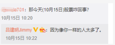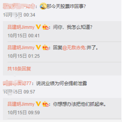 有评论问“那今天(10月14日)股票咋回事?”吕建明直接回复“问你,我怎么知道?”还有评论问“说说业绩为何会提前泄露”,吕建明回复“你想想办法把他们抓起来”。有评论问“那今天(10月15日)股票咋回事?”吕建明回复“因为像你一样的人太多了”。