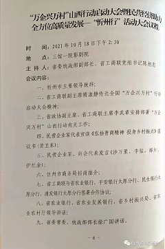 由山西省工商联、山西省乡村振兴局、山西省农业农村厅、山西省光彩事业促进会、中国农业银行山西省分行、中国农业发展银行山西省分行等联合主办的——“万企兴万村”山西行动启动大会暨民营经济助力全方位高质量发展“忻州行”活动于2021年10月18日在山西省忻州市繁峙县隆重举行。