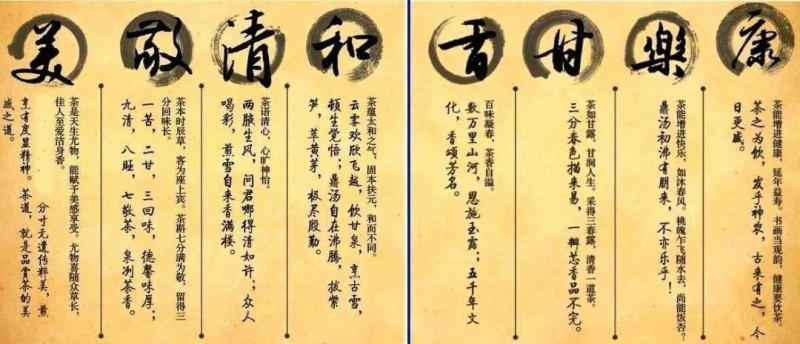 茶本时辰草,客为座上宾。茶斟七分满为敬,留得三分回味长。一苦,二甘,三回味,德馨味厚;九清,八旺,七敬茶,泉冽茶香。