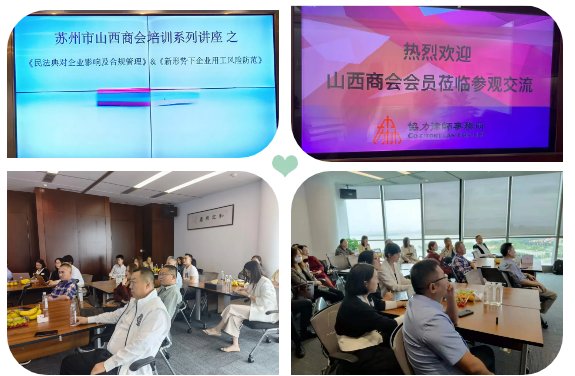 苏州市山西商会(中国晋商俱乐部联合发起机构)携手上海市协力(苏州)律师事务所和苏州昌晋劳务派遣有限公司, 于2021年10月12日下午在苏州中心协力律师事务所会议室举办了《民法典对企业影响及合规管理》&《新形势下企业用工风险防范》讲座。