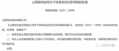 10月19日,山西银保监局官网披露的任职资格批复显示,批复同意核准武旭山西信托股份有限公司董事长任职资格,此举意味着武旭将正式出任山西信托“掌门人”。