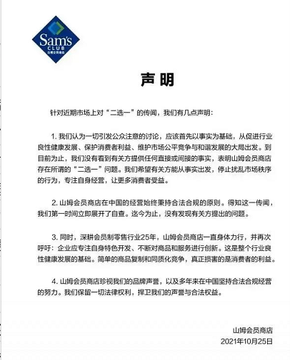 10月25日下午,山姆方面对记者回应称,针对近期市场上对“二选一”的传闻,有几点声明: