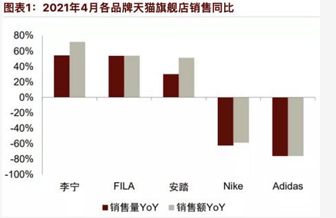 今年以来,国货运动品牌起势迅猛。4月,在Nike、adidas销售额同比下滑严重的情况下,国产运动品牌销售额实现了大幅增长。其中,李宁、FILA、安踏天猫官方旗舰店销售额分别同比增长72%、54%、51%。随后,鸿星尔克“野性消费”再度点燃消费者对国产运动品牌的消费热情。
