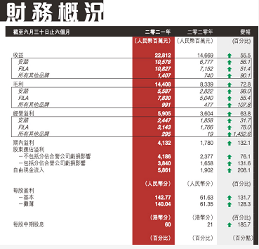 具体来看,2021年上半年,安踏体育实现营收228.12亿元,同比增长55.5%;经营溢利为59.05亿元,同比增长63.8%;股东应占溢利为38.4亿元,同比增长131.6%。