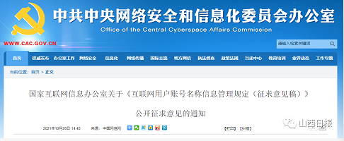 10月26日,国家互联网信息办公室发布《互联网用户账号名称信息管理规定(征求意见稿)》,互联网用户账号使用者注册账号时,应当与互联网用户账号服务平台签订协议,提供真实身份信息,遵守平台内容生产和账号管理规则、平台公约和服务协议。未成年人注册账号时,应当取得其监护人的同意并提供未成年人本人居民身份证号码用于真实身份信息核验。