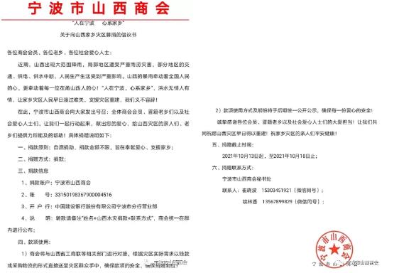 在此,殷桂生会长代表宁波市山西商会向所有捐款的会员及同乡们表示深深的感谢!感谢你们对家乡灾区的关心、支持和付诸实际的行动!同时,也转达山西省工商联、统战部及永济市统战部相关领导对大家爱心捐赠的感谢!