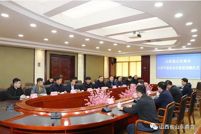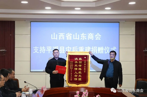 刘小虎秘书长代表商会在讲话中说,“天灾无情,人间有爱”。山西省山东商会在会长伊纪余的带领下,多年来一直响应习近平总书记和省委省政府的号召,按照省工商联行业党委的指示精神,主动担当作为,回馈第二故乡,多次组织会员企业家爱心捐款,为助力山西经济社会发展,积极发挥着商会组织的应有作用。这次定向捐赠平遥,是因为从媒体中看到平遥遭受暴雨时间长、全县有27.2万父老乡亲受灾、平遥古城墙局部倒塌,我们感同身受,愿意为平遥人民奉献一点绵薄之力,相信平遥人民在习总书记和党中央的坚强领导下,在山西省委省政府的精心部署和广泛动员下,在平遥县委县政府的团结带领和全力奋战下,一定能够取得这场灾后重建攻坚战的最终胜利。
