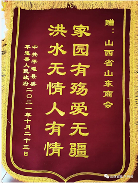 梁风旺副县长代表平遥县人民政府向商会颁发了捐赠荣誉证书,并赠送了“家园有殇爱无疆,洪水无情人有情”的答谢锦旗。刘小虎秘书长和马吉川副会长上台受领并与县领导合影留念。