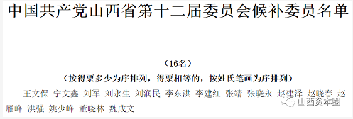 二、当选候补省委委员的有王文保(现任山西文旅集团党委书记、董事长)、刘军(现任华新燃气集团党委书记、董事长)、赵建泽(现任山西焦煤集团党委书记、董事长)、魏成文(现任太钢集团总经理、太钢不锈董事长)。