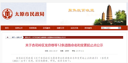 10月31日,市民政局消息,太原市拟命名(变更起止点)12条道路(街、巷),现正向广大市民征求意见。