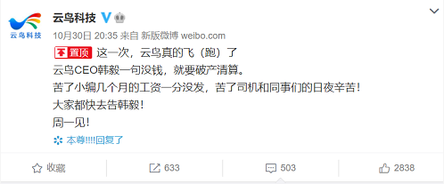 10月30日晚间,曾经的物流独角兽企业云鸟科技官方微博发布了一条消息,将坊间传闻的公司“跑路”消息间接证实。@云鸟科技 的官微发文,矛头直接对准了CEO韩毅,直言“大家都快去告韩毅”。这位员工称已经几个月没发工资了,而韩毅却一句没钱就要破产结算,“苦了司机和同事们的日日夜夜”。