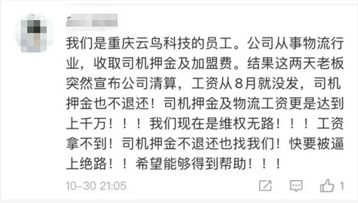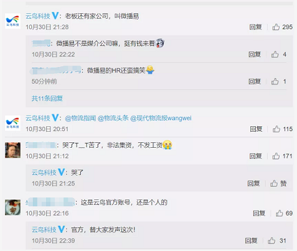 据红星资本局报道,10月31日,记者采访到了负责云鸟科技官方微博的王里(化名),她也是发布这条“特殊”微博的当事人。