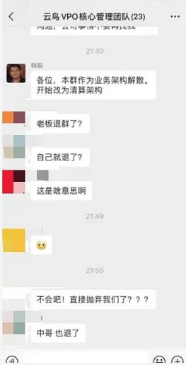 随后,王里给红星资本局展示了一张云鸟科技CEO与高管们的群聊截图。图中名为“韩毅”的人说道:“各位,本群作为业务架构解散,开始改为清算架构。”随后便退出了群聊,另一位高管云鸟科技的财务VP彭云中,也随之退出群聊。