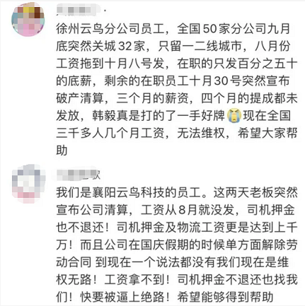 “10月30日,云鸟科技CEO韩毅突然通过电话会议通知高管们,公司一分钱工资不会发,即将对公司进行破产清算,所以想发微博告诉大家,希望大家赶紧维权。”王里对红星资本局说道。