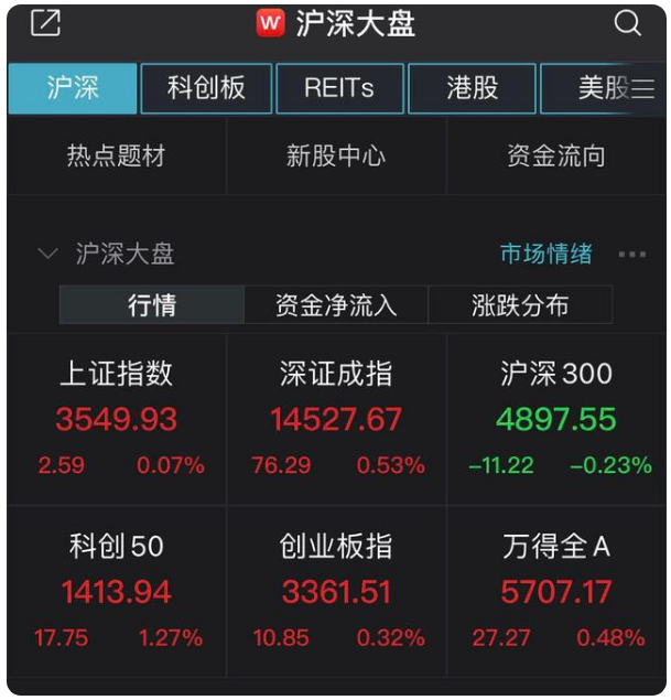 截至11月1日午间收盘,A股三大指数集体收涨。上证指数涨0.07%,报3549.93点。深证成指涨0.53%,报14527.67点。创业板指涨0.32%,报3361.51点。