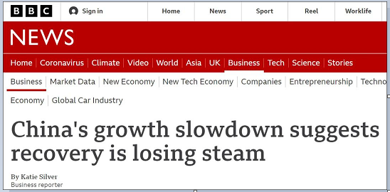 BBC:中国经济增速放缓表明(中国)正在失去复苏动力
