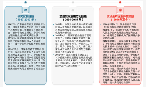 中药配方颗粒于 20 世纪 90 年代初,由江苏江阴天江药业首先研制,行业发展至今共经历了研究试制阶段、加速发展及规范化阶段及试点生产逐渐开放阶段三大时期。第一阶段: 1987- 2000 年,科研阶段,江阴天江药业、广东一方制药承担饮片改革试点生产研发任务;第二阶段: 2001 年-2015 年,为试点生产、使用阶段,增加三九药业、北京康仁堂等共计 6 家试点生产企业,承担中药配方颗粒标准的研制及统一工作;第三阶段:2016 年至今,为逐渐开放阶段,中药配方颗粒行业得到进一步促进和发展。