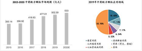 中药配方颗粒行业目前处于快速发展期,市场规模持续扩张,行业地位不断提高。工信部发布的数据显示,2019年度中药饮片主营业务收入约1932.50亿元,中药配方颗粒销售收入占中药饮片占其比重约26.01%,市场规模约502.59亿元。未来虽然受行业监管政策趋严,年复合增长率略有降低, 但中药配方颗粒行业在未来五年的市场规模仍将保持快速增长,预计年复合增长率为14.0%左右。