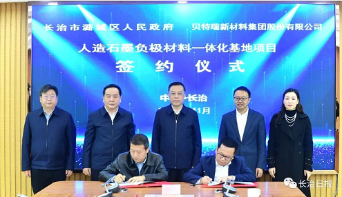 在全市上下深入学习贯彻落实省党代会精神之际,11月3日,潞城区政府与贝特瑞新材料集团股份有限公司举行人造石墨负极材料一体化基地项目签约仪式,标志着双方合作迈出实质性步伐,对长治市全方位推动高质量发展,加快建设全国资源型城市转型升级示范区具有重要意义。长治市委书记杨勤荣,市委副书记、代市长陈耳东出席并见证签约。市委常委、常务副市长张利锋,市委常委、秘书长胡勇,贝特瑞新材料集团股份有限公司董事长贺雪琴参加。