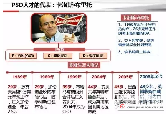 在他们眼中,所谓“对的人才”是指PSD人才,意思是家境或心态贫困(poor)、聪明(smart)和渴望成功(desire)。现任百威英博CEO的卡洛斯·布里托便是其中代表。布里托26岁考上斯坦福MBA但无力支付学费,得到了雷曼资助,1989年毕业后,在雷曼为其规划的梦想吸引下,放弃麦肯锡近10万美元的高薪工作加入了加伦迪亚,后随泰列斯进驻布哈马啤酒厂,此后几十年扎根啤酒行业,从巴西到南美,到西欧,到北美,成为了全球啤酒绝对龙头的CEO。布里托的成功既是自身努力的结晶,也是巴西三雄精心培育的成果。