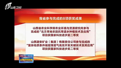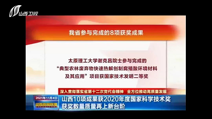 11月3日,2020年度国家科学技术奖励大会在京召开。山西省共10项科研成果荣获国家科学技术奖,其中山西省主持完成2项,参与完成8项。获奖数量、质量再上新台阶。