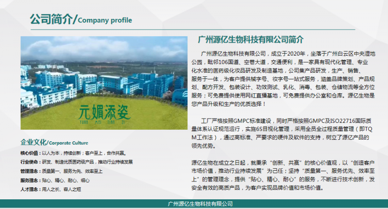元媚添姿系列产品,生产于广州源亿生物科技有限公司,广州源亿生物科技有限公司成立于2020年,坐落于广州白云区中央湿地公园,毗邻106国道,空巷大道,交通便利。是一家集团公司,一家具有现代化管理、专业化水准的医药级化妆品研发及制造基地,公司集产品研发,生产、销售、服务于一体,为客户提供械字号、妆字号一站式服务,涵盖品牌策划、产品规划、配方开发、包装设计、功效测试、乳化、消毒、包装、仓储物流等全方位服务;是药业生产厂家,产品是药品级别,安全性极高。可免费提供网红直播基地,免费提供办公室和仓库。公司所有产品是由中国人保一千万保险承保。源亿生物是您产品升级和生产的优质选择!