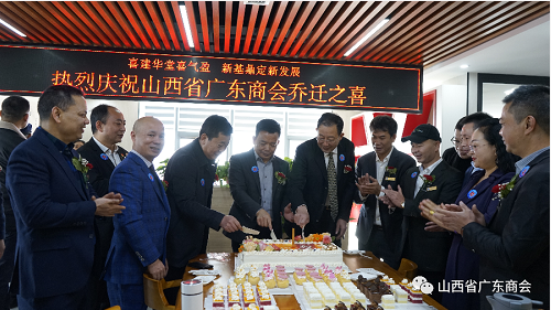 山西省广东商会会长曾建新、山西省浙江商会会长黄志强,以及到会的理事会成员共同切下了庆祝商会乔迁之喜的蛋糕