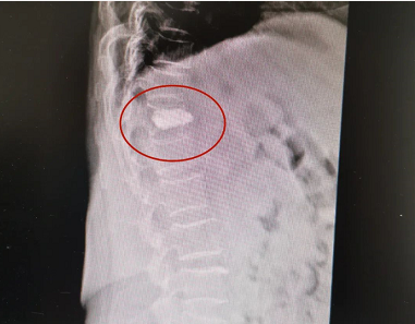 患者郭某,女,64岁,不慎摔倒,腰背部疼痛伴活动受限2天,休息后症状不见好转,就诊于我院脊柱科。X线片提示胸T12椎体压缩性骨折。完善术前相关检查后,来院第二天予患者行胸T12骨水泥椎体成形术,手术约30分钟后,患者自觉腰背部疼痛明显减轻。术后第二天拍片复查后,患者带腰围可下床自行活动。