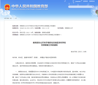 为切实做好今冬明春北方地区农村学校冬季取暖工作,确保广大师生安全温暖清洁过冬,维护教育系统改革发展稳定。教育部办公厅发布《关于做好北方地区农村学校冬季取暖工作的通知》。