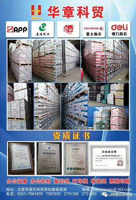 山西华章伟业科贸有限公司创建于2007年11月。其中一家门面位于长治路寇庄北街世纪嘉园底商,一家仓储坐落在138物资储备库。山西悦华祥商贸有限公司创建于2016年3月,目前是股份制公司,主要以智慧产业园为中心。这两家公司主要是以批发和零售办公设备、办公用品、办公耗材、劳保用品为主的综合性贸易公司。公司在做好批发业务之余更专注于商务办公服务领域,追求卓越的服务品质,推广最新的办公理念,创造轻松的办公环境,以保障客户的商务办公活动高效、稳定运行为已任。我们力争以优质的商品、更低的价格和全面配送售后服务,为广大客户打造一个全新的购物平台。