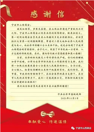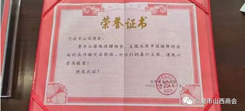 收到物资后中共永济市委统战部对在山西暴雨灾害中伸以援手的宁波市山西商会颁发了荣誉证书并转发了感谢信。