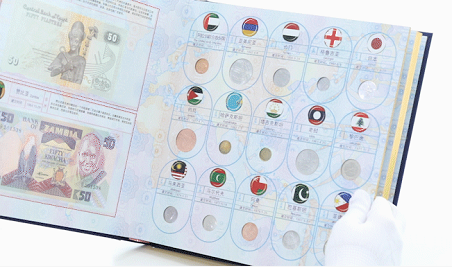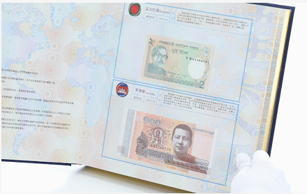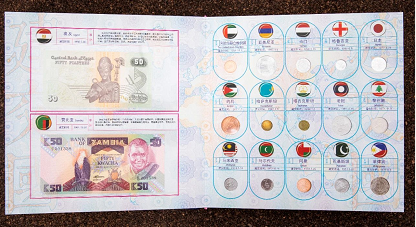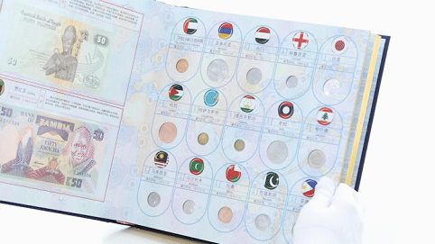 钱币册中收录了与中国建交的180个国家中,其中100个极具代表性国家法定钱币,包含纸币16枚,硬币84枚,每一枚都意义非凡。