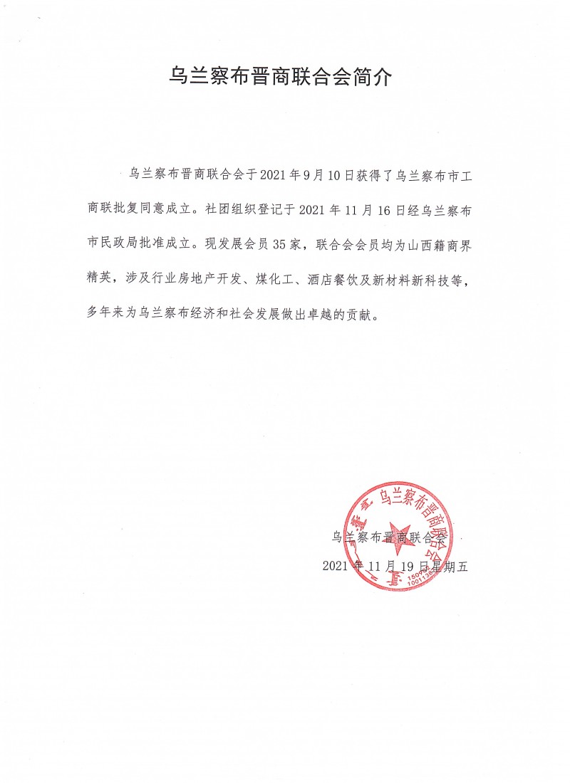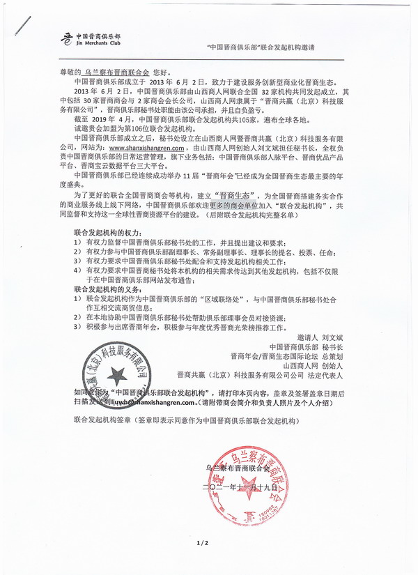 2021年11月19日,晋商俱乐部秘书处收到内蒙古乌兰察布晋商联合会加盟为晋商俱乐部联合发起机构的合作意愿,回执如下: