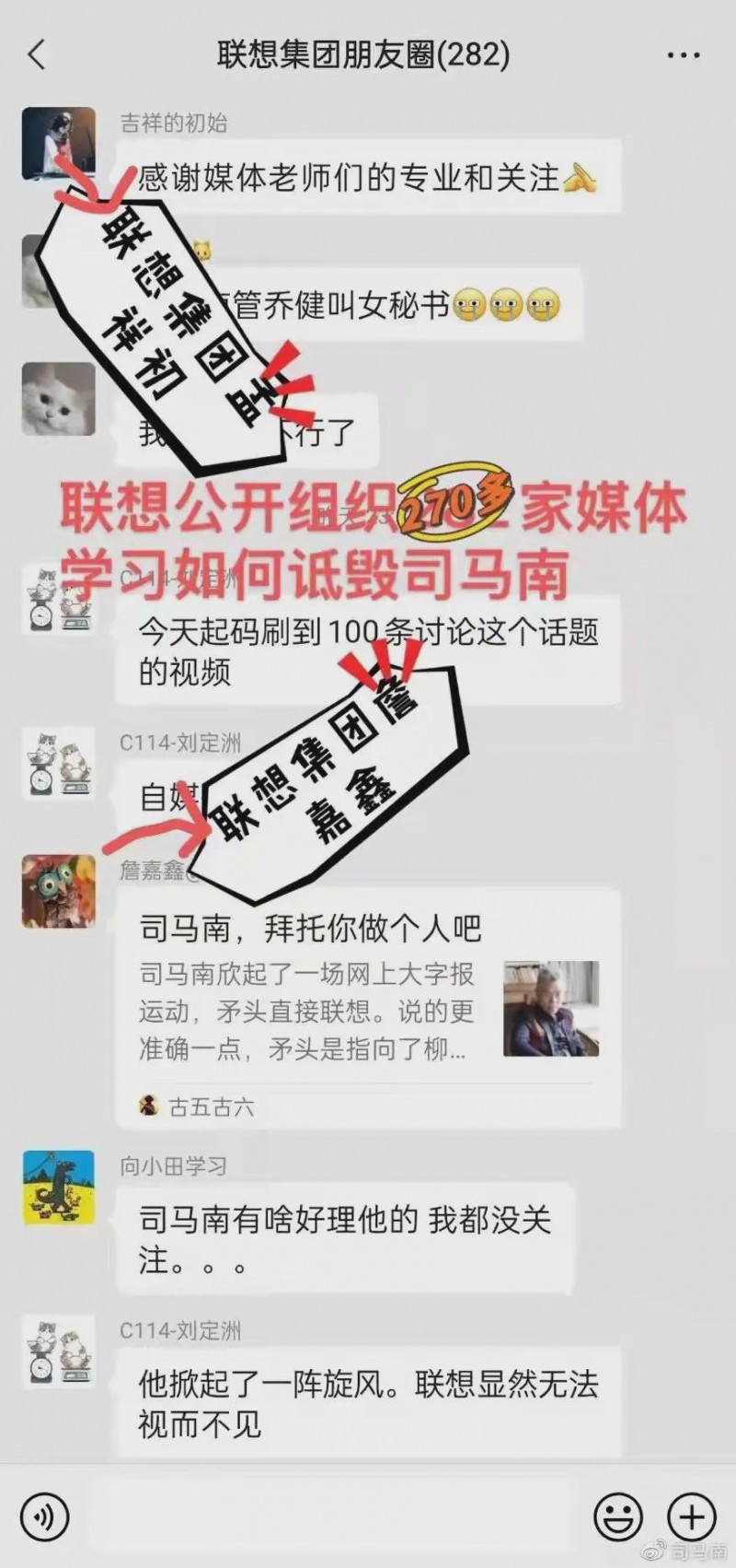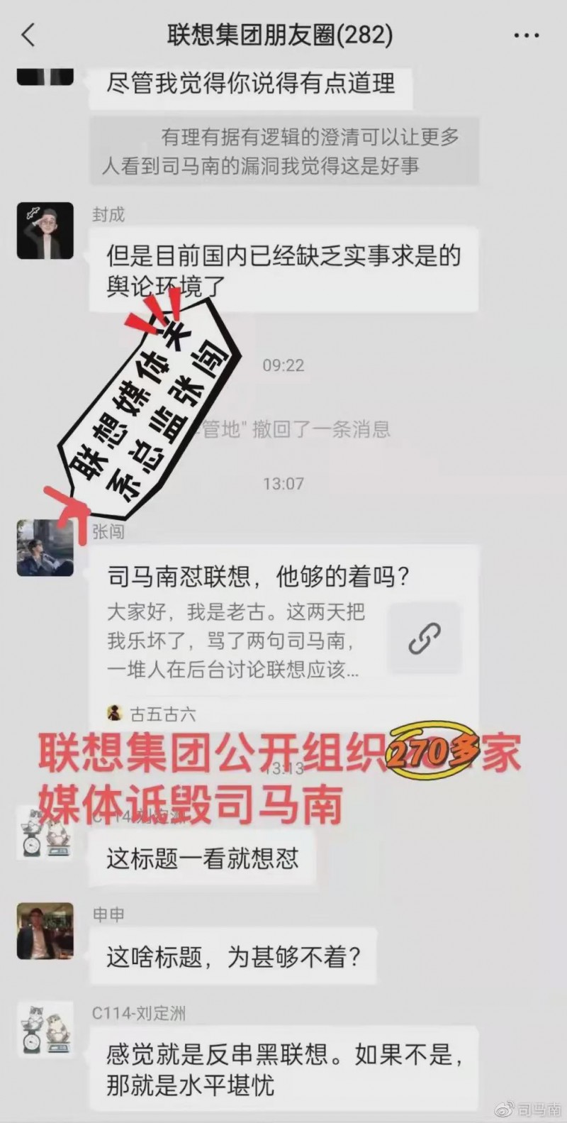 发个律师函多大的事儿啊?起诉司马南侵犯联想名誉权,多大个事儿啊?这些手段联想均不采取,先是三番五次摆下鸿门宴,请我吃饭喝茶要跟我讨论什么民族企业发展还要赞助支持爱国团体和学者……被我拒绝了之后,他们就做了如图这些勾当。