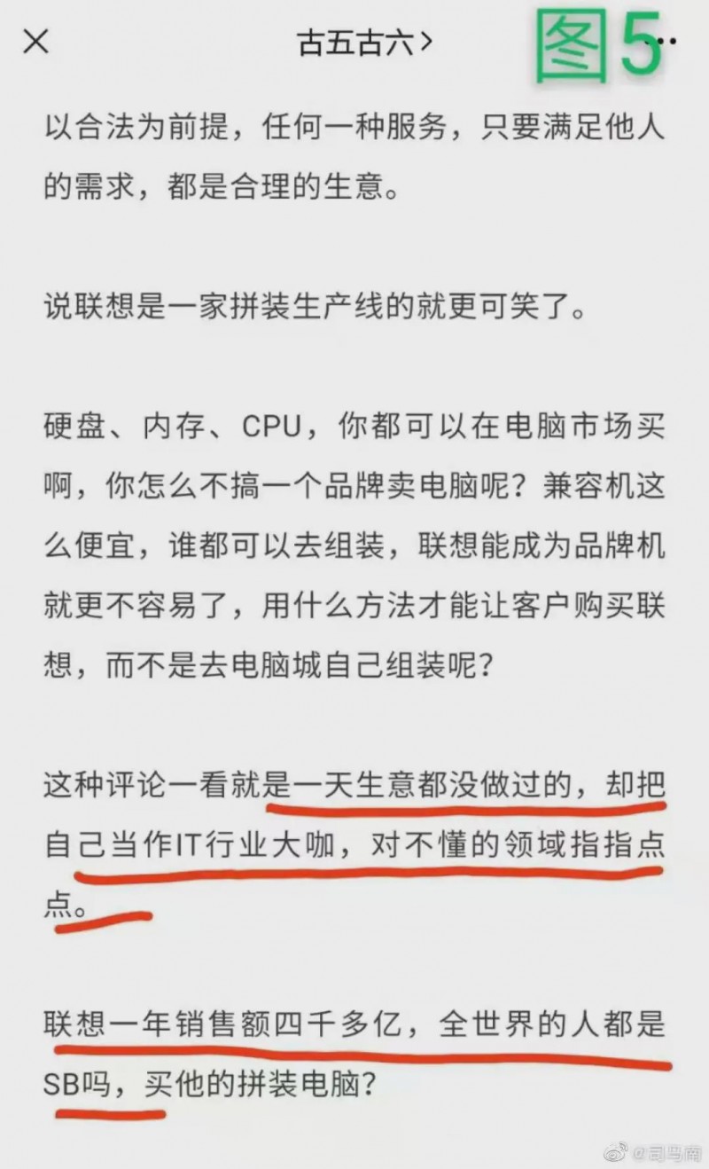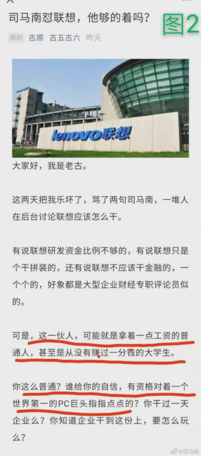 学习联想大佬四处兜售的文章《司马南怼联想,他够得着吗?》,我有以下几点体会。