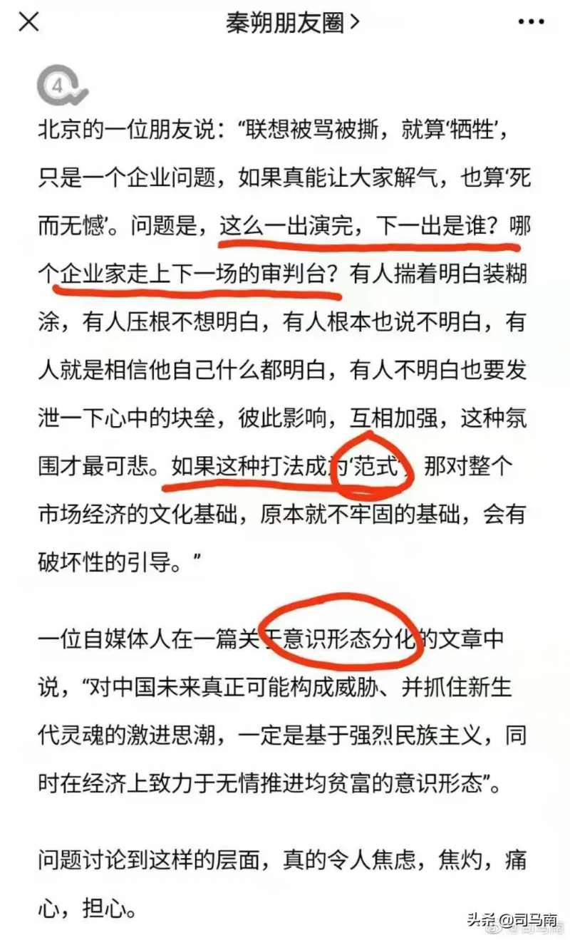 6. 行文至此,秦先生笔锋一转,对司马南反复强调的“无形资产过高实际已资不抵债、欠供应商上千亿货款的情况下还给高管发天价薪酬、高管和核心技术人员中外国人超过一半可能存在信息安全隐患、研发投入低非科技企业而是以放贷等金融业务为主”的问题一言不发,开始大谈意识形态、大力渲染一种让民营企业家惴惴不安的氛围,这一招儿,让我这个胡同串子诚惶诚恐……