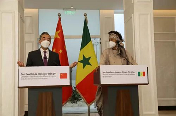 当地时间2021年11月28日,国务委员兼外长王毅在达喀尔同塞内加尔外长艾莎塔会谈后共同会见记者。外交部网站图