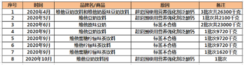 另据海关总署统计数据,仅在2020年,维他奶国际就有共11批次商品被拒入境。