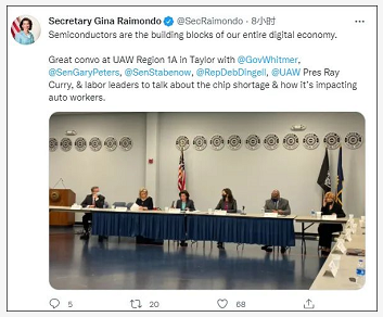 雷蒙多在密歇根州听到汽车行业正面临持续的芯片供应危机:“现实就是,如果我们不增加芯片的供应……密歇根州将会损失就业岗位。”