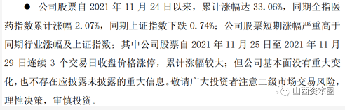 不出意外,上一交易日刚刚发布股价异动公告的亚宝药业再度“发文”,此次则更为直接:公司股票连续 3 个交易日收盘价格涨停,累计涨幅达 33.06%,短期涨幅严重高于同期行业涨幅及上证指数,但公司基本面没有重大变化,也 不存在应披露未披露的重大信息,敬请广大投资者注意二级市场交易风险,理性决策,审慎投资。