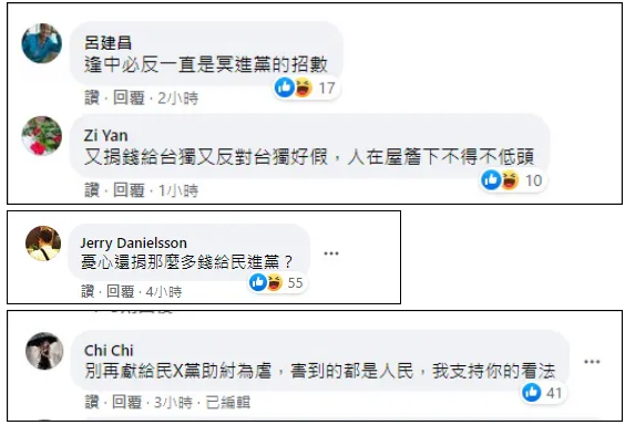 也有网民表示,给民进党捐钱,害得“都是台湾人民”
