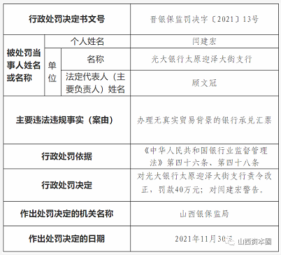 光大银行这一最新处罚信息显示,光大银行太原迎泽大街支行因办理无真实贸易背景的银行承兑汇票,违反《银行业监督管理法》第四十六条、第四十八条规定,除对自然人闫建宏警告外,还判罚要求光大银行太原迎泽大街支行责令改正,并处罚款40万元。