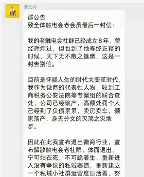 日前,一张龚文祥“致全体触电会老会员最后一封信”的微信消息截图在社交网络广为流传。在信中,龚文祥称:“我作为微商的代表性人物,收到了工商税务公安法院等专案组的联合查处,公司已经破产,高额处罚个人已经到了负债累累,卖房卖车,倾家荡产,身无分文的灭顶之灾地步。”