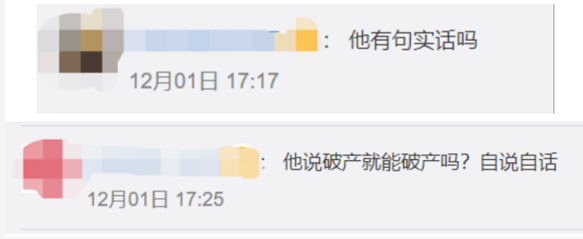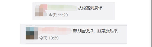 然而龚文祥破产的信息传出后,不少网友认为他只是在“卖惨”“割韭菜”,质疑其破产的真实性,认为这只不过是龚文祥“演得一出戏”。甚至直言“此人的话能信,母猪都能上树”“微商大多收智商税割韭菜赚钱,这些人不下地狱谁下地狱”。
