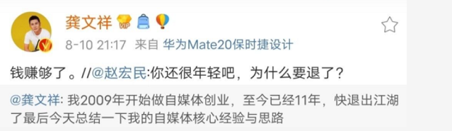 此外,龚文祥早在2020年8月就曾表示自己要“退出江湖”,原因居然是是“钱赚够了”。
