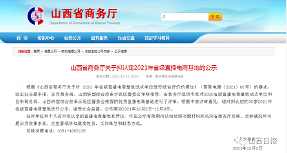 根据《山西省商务厅关于对 2020 年省级直播电商基地试点单位进行综合评价的通知》(晋商电便〔2021〕68号)的要求,经企业自愿申报,各市商务局、山西转型综合改革示范区管委会审核推荐,省商务厅组织专家对2020省级直播电商基地试点单位和各市商务局、山西转型综合改革示范区管委会推荐的优秀直播电商基地进行了评审。根据专家评审意见,现对拟认定的30家2021年省级直播电商基地进行公示,接受社会监督。公示期为2021年12月3日—12月9日。